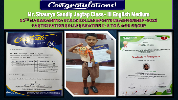 Shaurya Sandeep Jagtap Std. I (A2) (English Medium) student participating 35th State Roller Skating Championship.